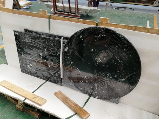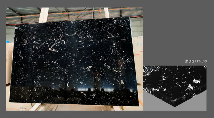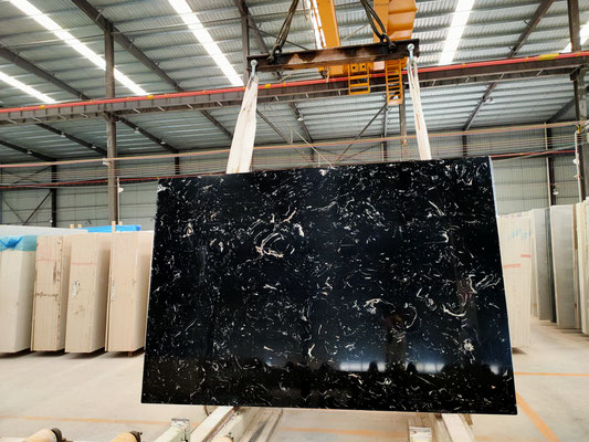 Artificial marble slabs features a striking black base color intricately veined with dynamic white patterns, reminiscent of natural stone. The contrast between the deep, rich black and the lively white veining creates a luxurious and modern aesthetic. Ideal for high-end interiors, these slabs combine the elegance of marble with the durability and consistency of engineered materials. The pattern is bold yet sophisticated, making it suitable for applications such as countertops, feature walls, flooring, and custom furniture.
